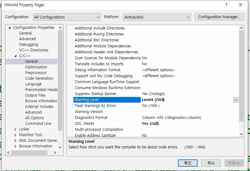 2. All Configurations - C/C++ - General 탭에서 Warning Level을 Level4로 맞춰준다.