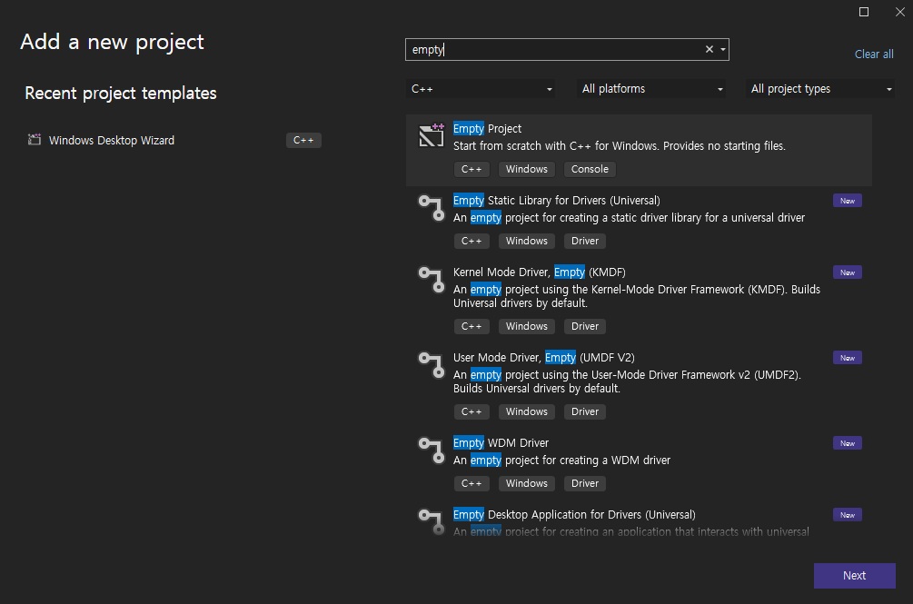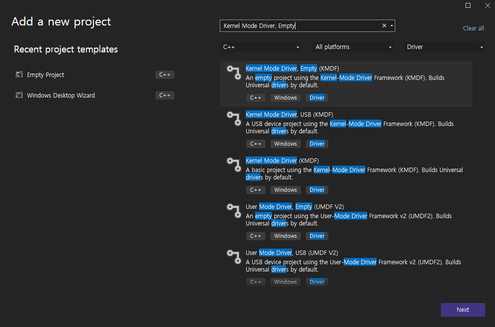 다음으로 솔루션에 또 다른 프로젝트를 생성해주자. 프로젝트는 Kernel Mode Drive, Empty로 지정해주자.