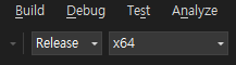 Debug Option을 Relase, x64로 설정해주고 Build - Build Solution 클릭.