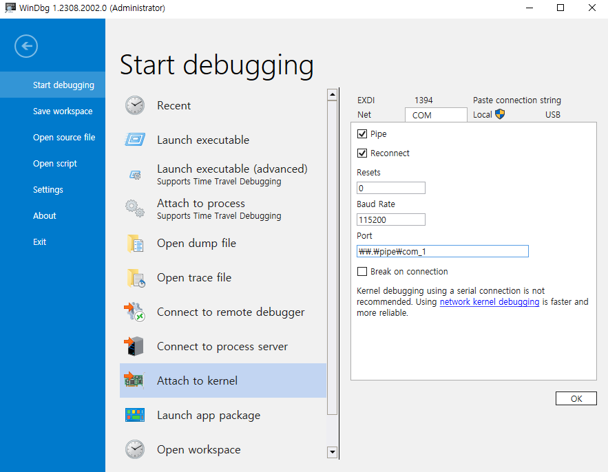 Start debugging - Attach to kernel - COM에서 위와 같이 설정해준다.