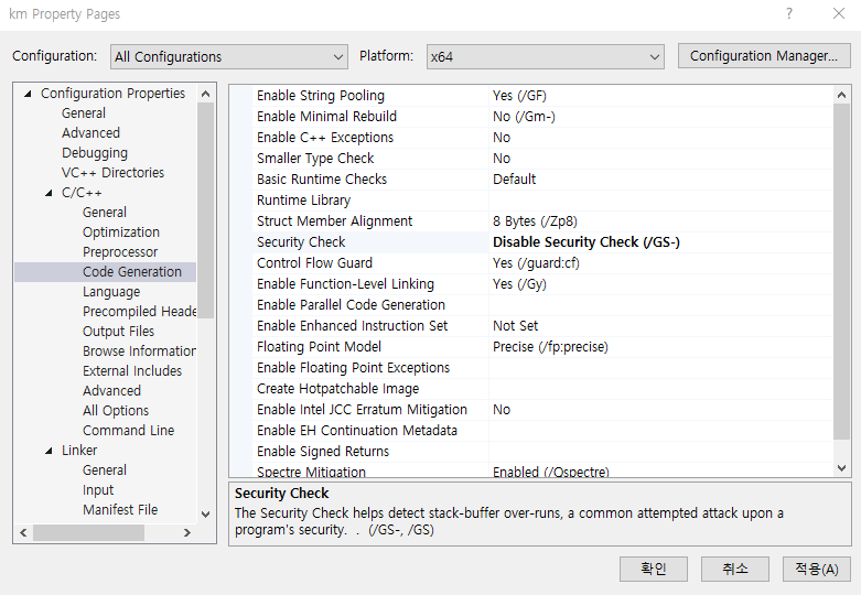 C/C++ - Code Generation에서 Security Check을 disable security check 해준다.