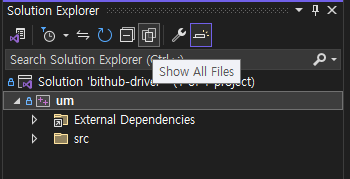 먼저 솔루션 빌드에서 Show All Files 아이콘을 눌러 필터를 꺼주고 실제로 있는 폴더 및 파일만 보이게 하자.