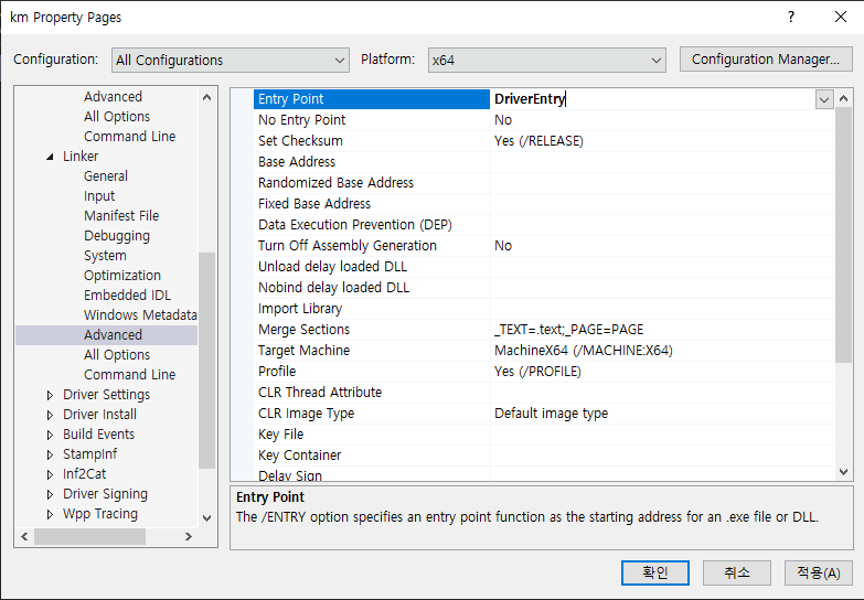 Linker - Advanced 탭에서 Entry Point를 FxDriverEntry에서 DriverEntry로 바꿔주자.