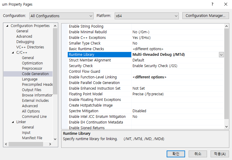 다음으로 C/C++ - Code Generation에서 Runtime Library를 /MTd로 설정해주자.