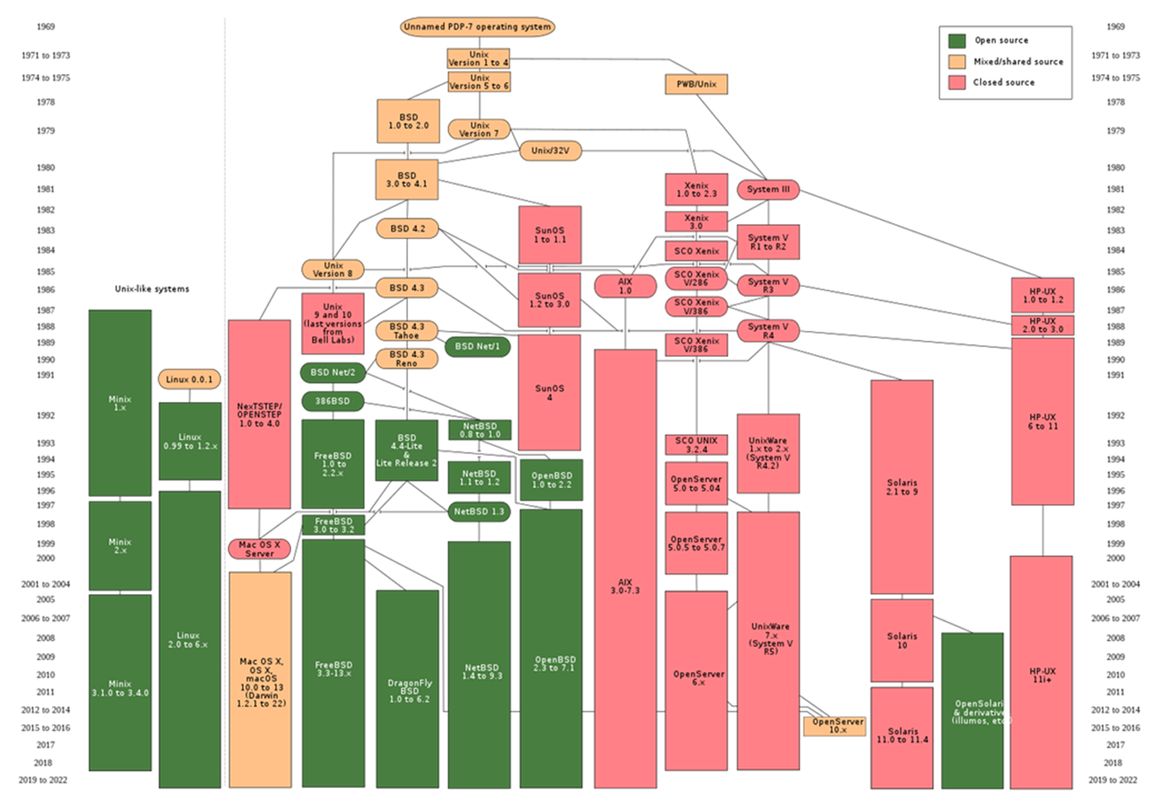 70년대 초에 개발되었으며 추후에 AT&T SysV 계열과 BSD 계열로 나뉘어 발전하게 된다.
