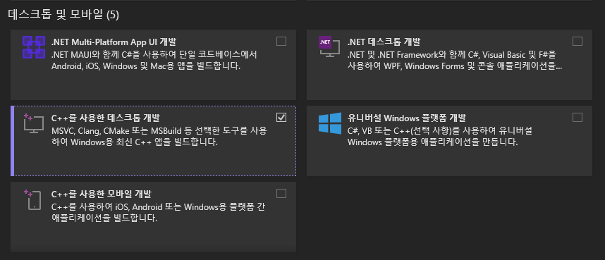 C++을 개발하기 위해서는 Workload에서 반드시 [C++를 사용한 데스크톱 개발]을 선택해야 한다.