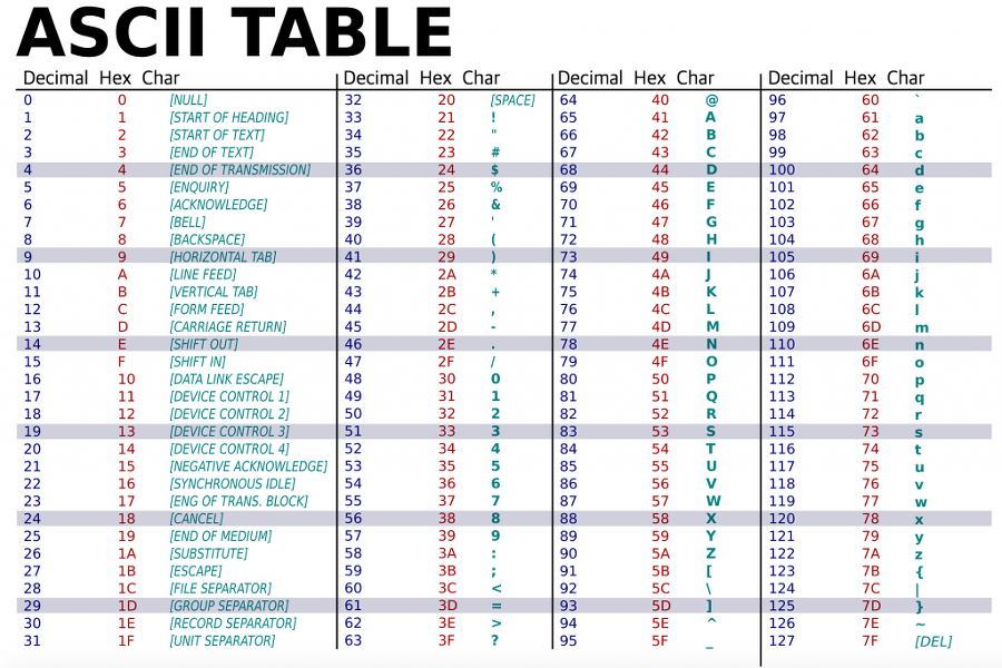예를 들어, 문자 'a'를 아스키코드로 부호화하면 0x61이 된다.