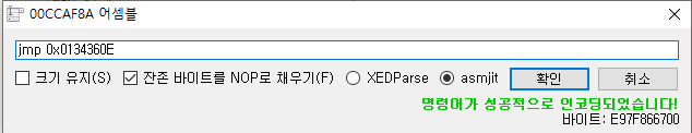 위 코드를 jmp 0x0134360E로 바꿔줄 것이다.